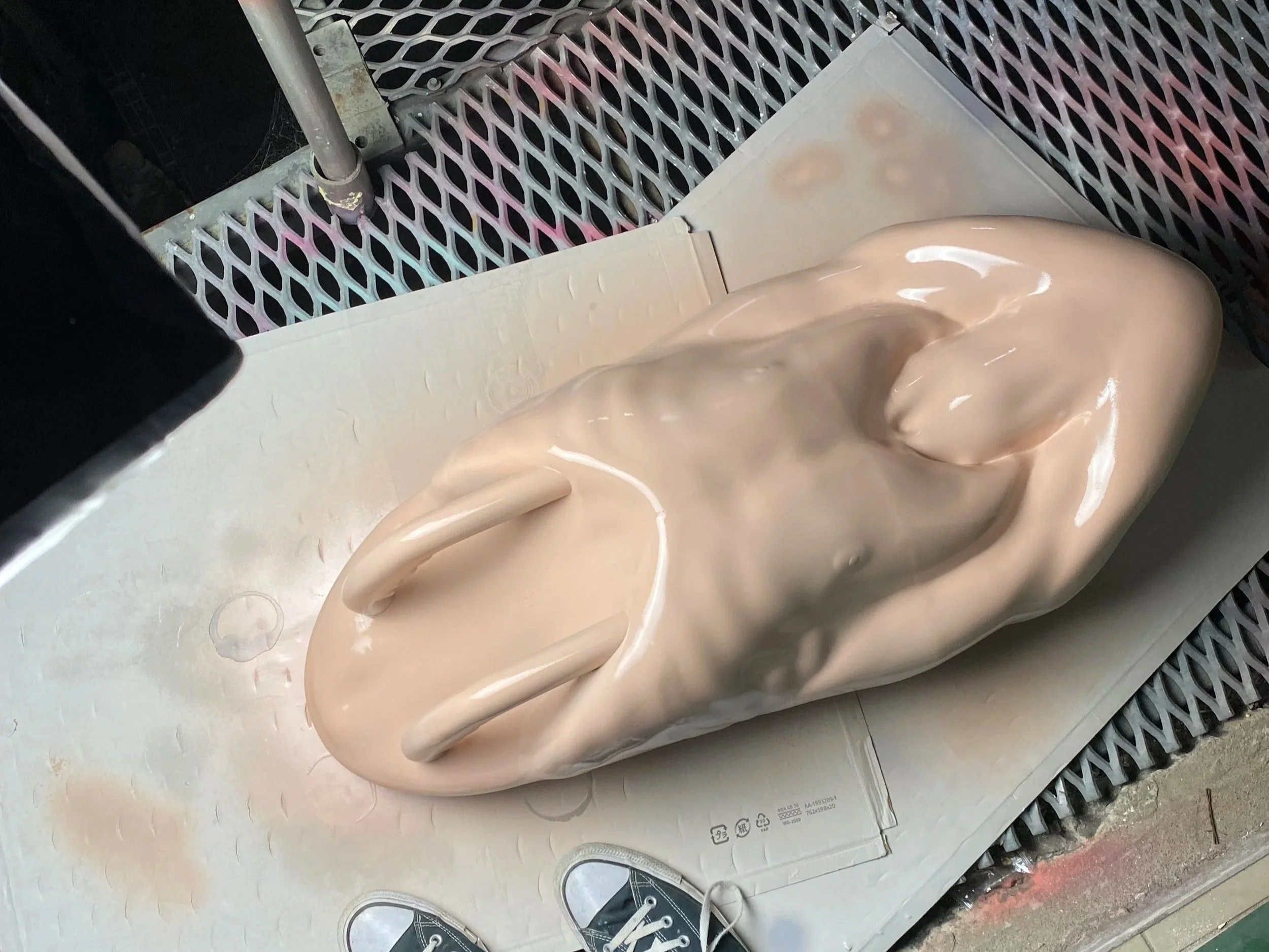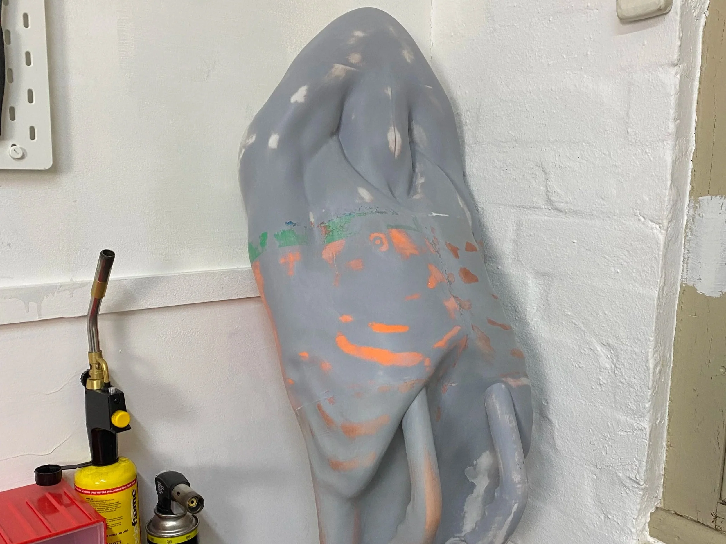 This sculpture began with an idea I could not ignore. a vision of transforming my own body into a surf device. To realise it, I suspended myself from a hang board while a friend captured my form through photogrammetry. The scan was refined in Blender, where I reshaped the anatomy: merging the arms into the nose of the device, carving out my stomach to make room for the handles, and adding details like the ribs and nipples as they were not in the original scan. After multiple iterations, the design was segmented for 3D printing.The printed components were then assembled, glued, and meticulously sanded to eliminate seams. Finally, the surface was primed and painted to make it waterproof for the ocean.